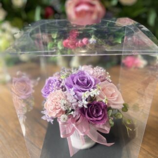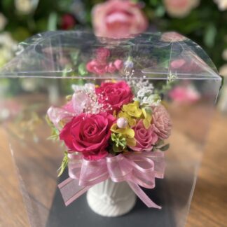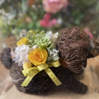 犬のバケットにバラ花可愛いプリザーブドフラワー